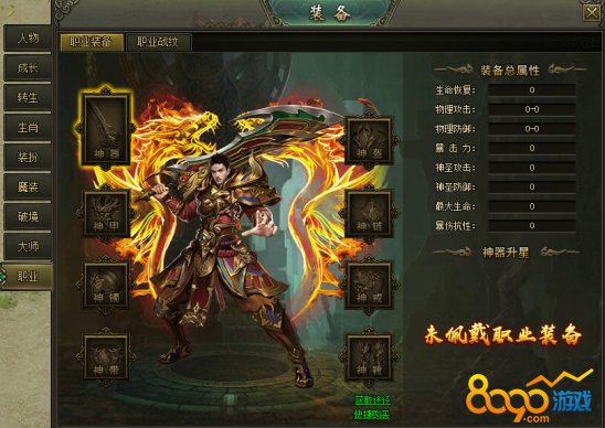 (2)职业装备分为神器、神甲、神盔、神链、神镯、神戒、神带、神靴8个部位