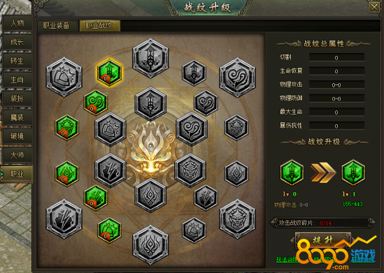 (1)开启条件:玩家转职成为怒战士,可通过点击“人物-职业-职业战纹”页签打开界面