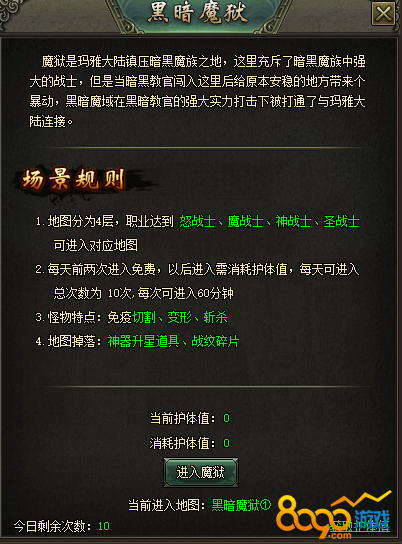 (1)进入条件:玩家转职成为怒战士,可通过点击封魔古都NPC“黑暗魔狱”打开界面