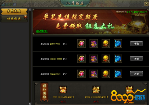 (2)活动一单笔充值:活动期间单笔充值指定金额可领取大量奖励,连续充值3天可额外获得绝版称号