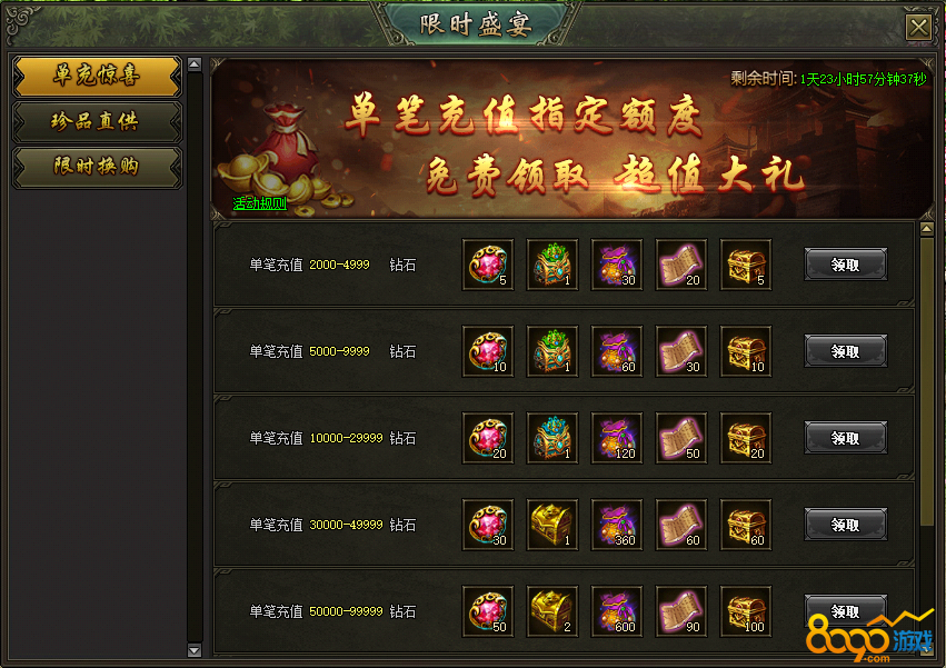 (2)活动一单充惊喜:活动期间,单笔充值达到指定档位的玩家可领取对应奖励