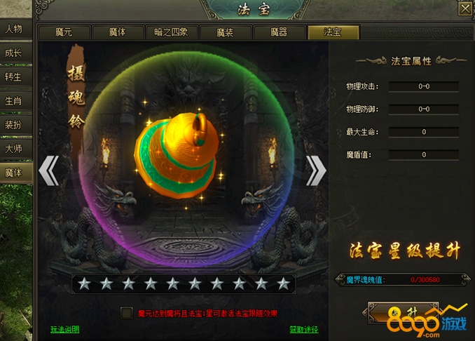 (1)开启条件:开服天数≥12天,并且玩家等级达到300级,可通过点击“人物-魔体-法宝”页签打开