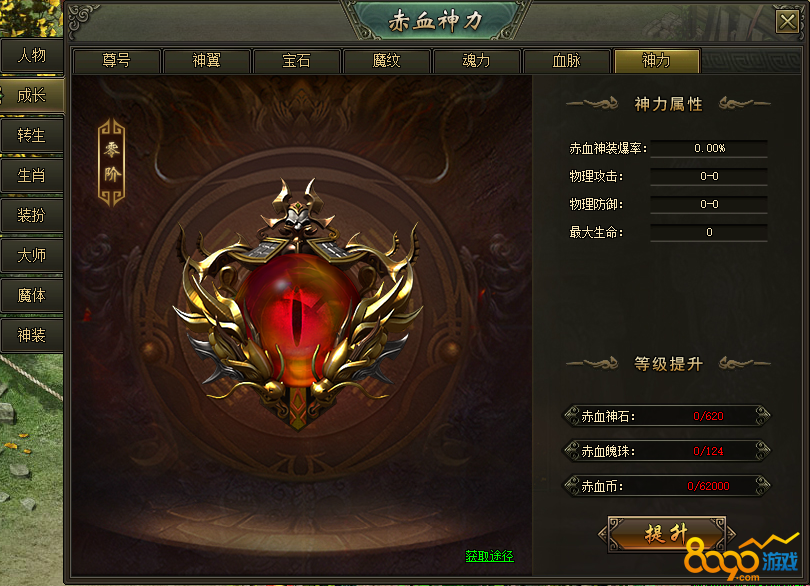 (2)可消耗赤血神石+赤血魄珠+赤血币提升赤血神力等级,增加角色属性