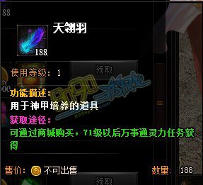 天翎羽可以培养神甲,为你任务提升很高的属性,当然,天翎羽也不容易获得。
