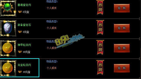 在热血战纪中,神甲和法宝升到10阶10级后,六道轮回功能开启。六道将会分别增加额外的属性,六道的重数越高,加成属性越惊人。分别消耗灵力和战魂可点亮六道,当六道全部达到一重后,才会开放第二重。当所有六道轮回都达到300重时,会开启六道五行属性。而法宝轮回丹的作用就是用来升级六道轮回哦,双击使用就可以啦。法宝轮回丹可通过商城直接购买获得,也可以通过活动获得。