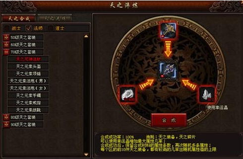 天之合成系统是专门外天之套装准备的,只需放入一件金色装备,一定数量的天之碎片和幸运晶,即可保留原属性的同时,获得崭新的天之装备。而且每个区前10件天之装备,还有较高的几率提升随机属性值的上限哦!