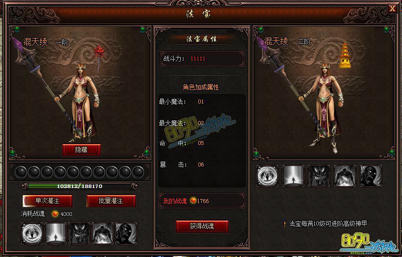 在热血战纪中,法宝功能开启条件为35级,每阶法宝分为10个小阶,每个小阶升级后可获得大量属性值且法宝技能会根据法宝的等阶进行开放,升级法宝需要战魂,战魂可在魔舰副本内通过击杀怪物获得,击杀的怪物越多获得的战魂越多,且出副本后还可根据自己的需求领取多倍额外战魂奖励!