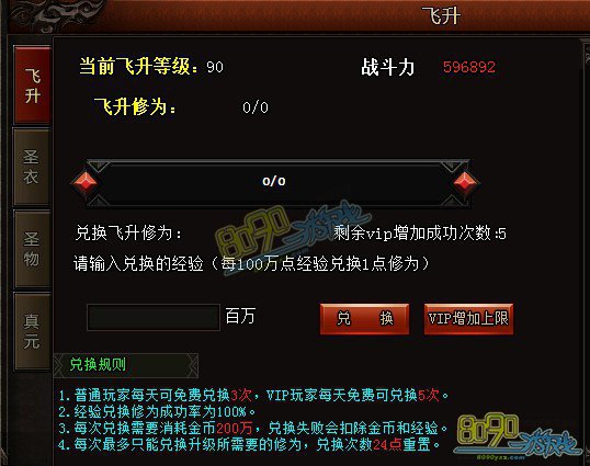在热血战纪中,飞升修为是可以用经验兑换的,普通玩家每天可免费兑换3次,VIP玩家免费可兑换5次。经验兑换修为成功率为100%,每次兑换需要消耗金币200万,每100万点经验兑换1点修为。而这里的剩余VIP增加成功次数的意思,也就是VIP玩家可以继续兑换的次数,想要增加飞升的剩余次数,可以点击飞升面板的VIP增加上限按钮哦。