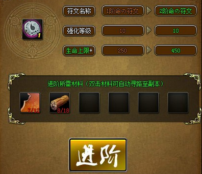 符文每强化十级,就需要进阶一次,属性会大幅度提升。进阶需要消耗对应的材料,而材料由普通副本掉落。只需要双击所需的材料,便可自动寻路到相应的副本。材料显示的Tips也会写明产出的副本。