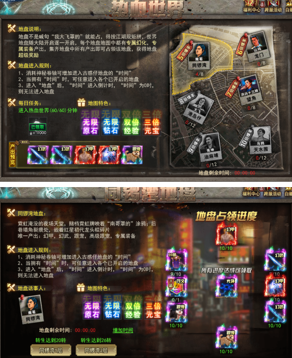 通过消耗神秘卷轴进入热血世界,热血世界共设六大地图,击杀每张地图内的BOSS获取不同的新奇时装,羽翼翅膀,光环,跟宠,符文,足迹。