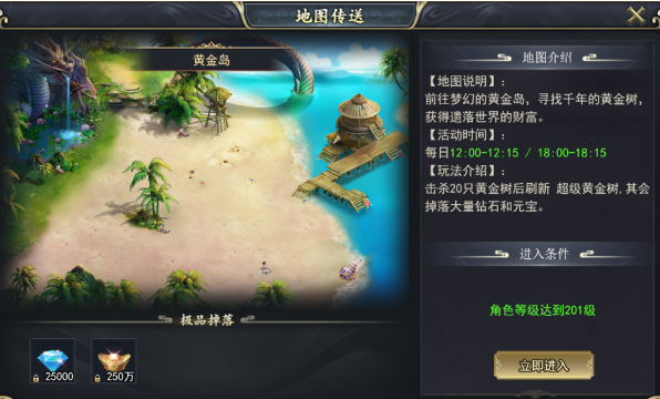 玩法介绍:击杀20只黄金树后刷新 超级黄金树,其会掉落大量钻石和元宝。