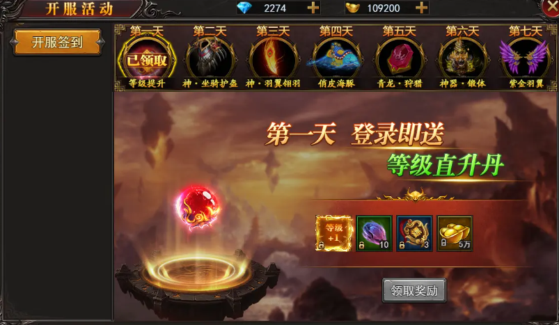 2、开服7天签到送坐骑、神器、翅膀、神装!