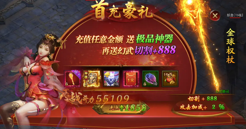 4、首充豪礼,充值任意金额送极品神器!
