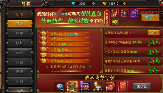 战将系统是游戏前期让玩家熟悉游戏且收益丰厚的系统,所有奖励免费领取。战将系统最重要的功能就是远程回收装备,解锁第二阶战将--跃升战将之后,玩家将不会再因为背包爆满而频繁的往来于主城和野外,游戏体验有极大的提升,请务必解锁该功能。