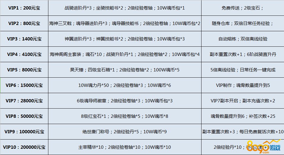 1、 VIP系统成长的系统,VIP等级随着玩家的累计充值数量的增加而成长,一共有V1到V10十个等级;