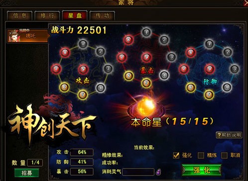 星盘系统将会是增强家将战斗力与防御力的重要渠道。在逐层精修提升属性的同时,精修点满15/15星,将会激活本命星,此时将会随机附加本命星效果。如果你对附加的效果不满意,还可以通过精炼来刷新效果。