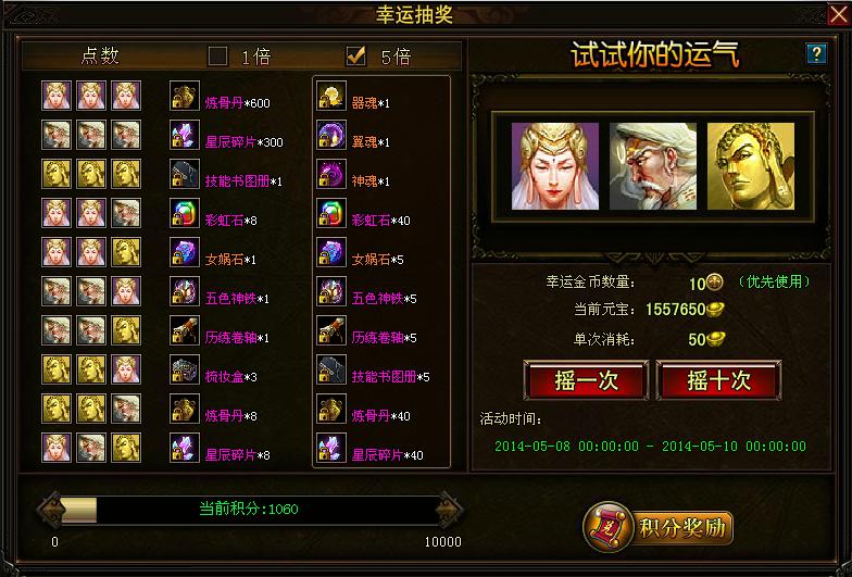 活动按照投放区服世界等级不同奖品也不相同,活动期间,勾选1倍或者5倍活动其中之一,根据勾选显示单次消耗元宝 1倍10元宝 ,5倍50元宝,如有足够数量幸运金币会优先使用幸运金币进行抽奖,根据摇出来3个图像的显示给与相应的道具奖励并给与积分,1倍寻宝每次增加1点积分,5倍寻宝每次5点积分,积分达到一定数量可获得积分奖励!