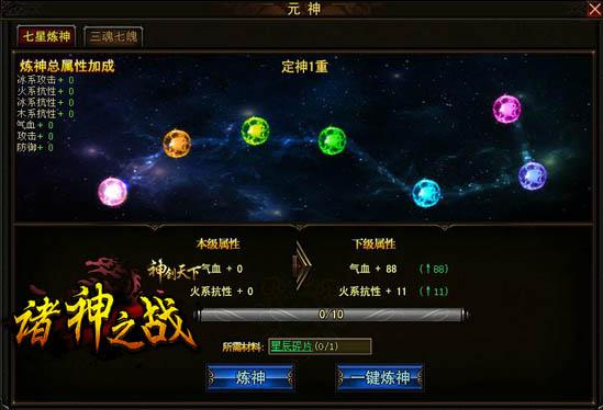 玩家等级达到65级时才可以进入七星炼神,每激活一个炼神球就会获得当前炼神球的属性加成,7个炼神球激活满进入下一重,10重都点满自动进入下一层。