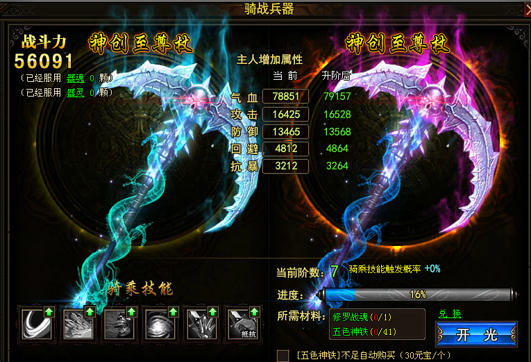 开光可提升300级,每100级更换一次骑兵外形(3个外形各100%的进度),每100级增加骑兵技能触发概率1%。