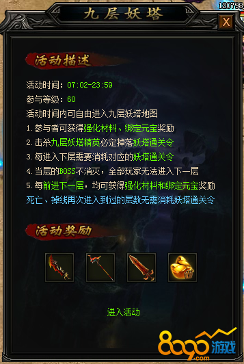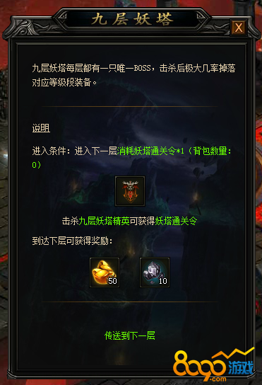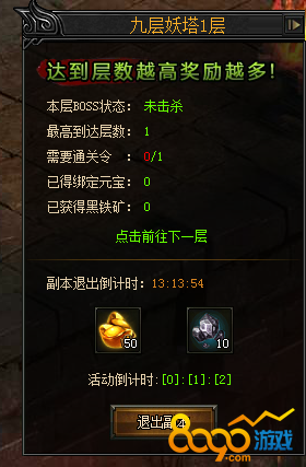 九层妖塔中,每进入下一层都可获得绑定元宝和黑铁矿的奖励