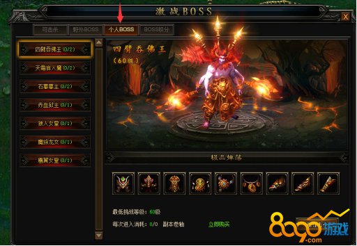 点击个人BOSS即可显示个人可以挑战的BOSS信息,包括BOSS等级、BOSS可击杀次数、玩家挑战所需等级、击杀掉落等。