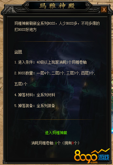 玛雅神殿一共5层,每层都有大量BOSS,击杀后可获得极品装备,是玩家行会争夺资源的首选(玛雅卷轴可在商城购买)
