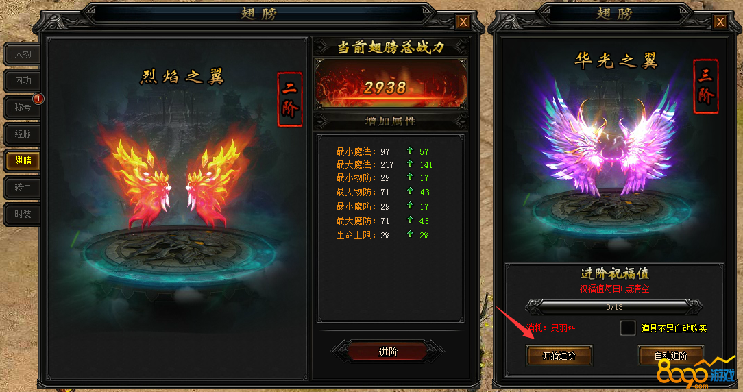 玩家通过控制面板的“人物”按钮进入人物界面,切换到“翅膀”标签页,当玩家满足拥有翅膀之后,通过获取“灵羽”来进行对翅膀的升阶。