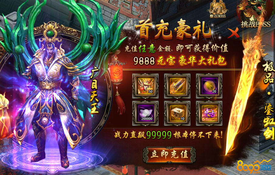 活动规则:活动期间,玩家充值任意金额即可获得超值首充大礼,更有圣级武将广目天王招致麾下。