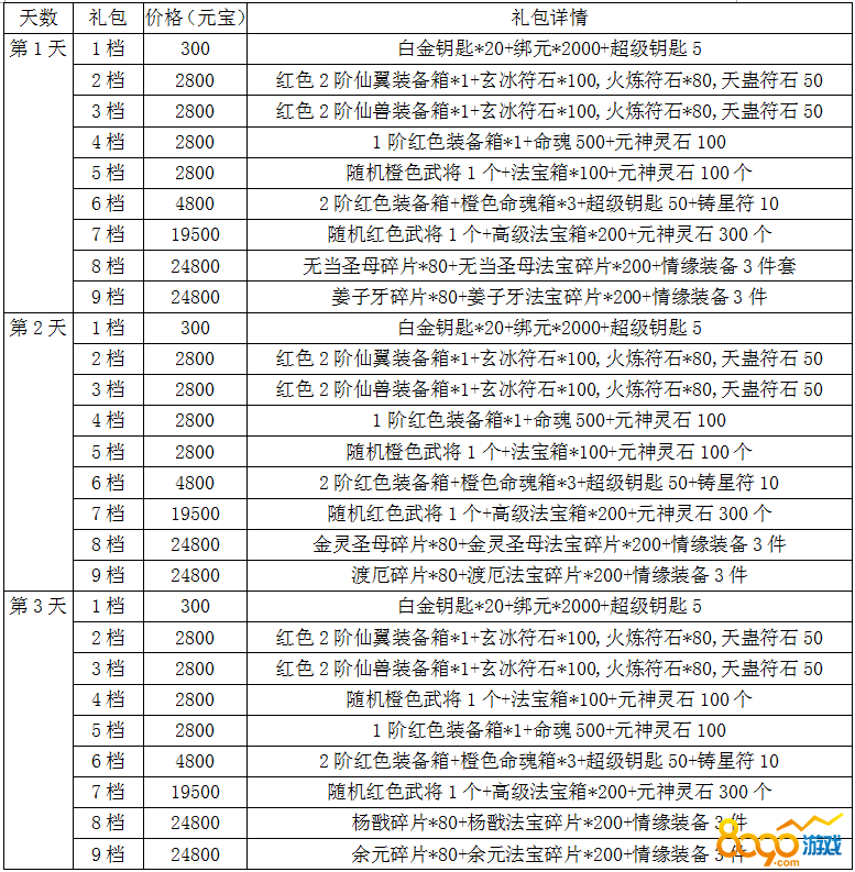 活动说明:活动期间,玩家可在活动大厅购买超值大礼包,每日的礼包都不同,不要错过。