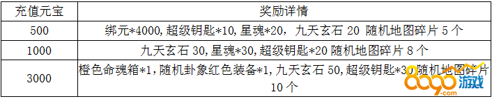 活动说明:活动期间,将开启消费元宝抽奖活动,每消费1000元宝可抽取一次,并且抽取达到一定次数,即可领取大礼包。