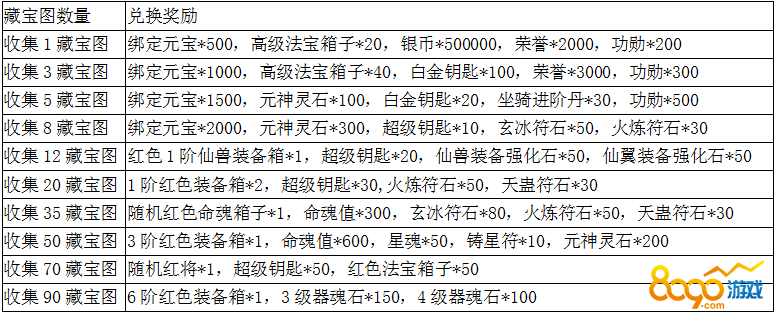 活动说明:玩家收集9片“藏宝图碎片”即可合成一个藏宝图,集齐相应个数的藏宝图即可兑换下方奖励(藏宝图击杀BOSS可以掉落,并且可以使用元宝来替换藏宝图兑换奖励)