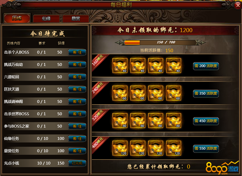 完成历练任务,可获得活跃值,达到一定数量的活跃值,便可领取大量绑定元宝。