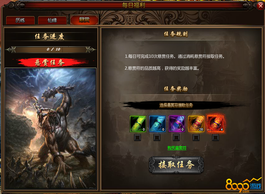 悬赏任务需要使用悬赏符来接取,悬赏符品阶越高,接取的悬赏任务奖励也会越丰富,每天只能完成十次,千万不要浪费次数。