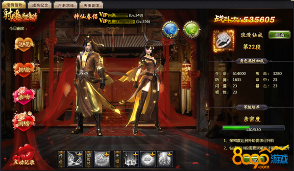 搜索"8090网页游戏"在江湖中,除了刀光剑影与快意恩仇,也有书香美人和侠骨柔情。在《射雕英雄传》的“姻缘”系统中,侠士们可以在“姻缘树”下寻找有缘人,与心仪之人结成夫妻。结成伴侣的侠士会获得可成长的特殊装备“钻戒”,还能习得“比翼齐飞”、“花好月圆”等夫妻专属技能。除此之外夫妻之间还可通过“洞房”、“拥抱”等互动方式提升亲密度,解锁夫妻专属副本。游戏中向心仪之人送出钻戒,待对方回应双方便可结成夫妻哦。