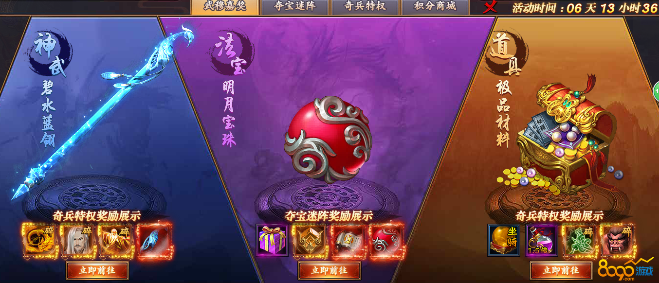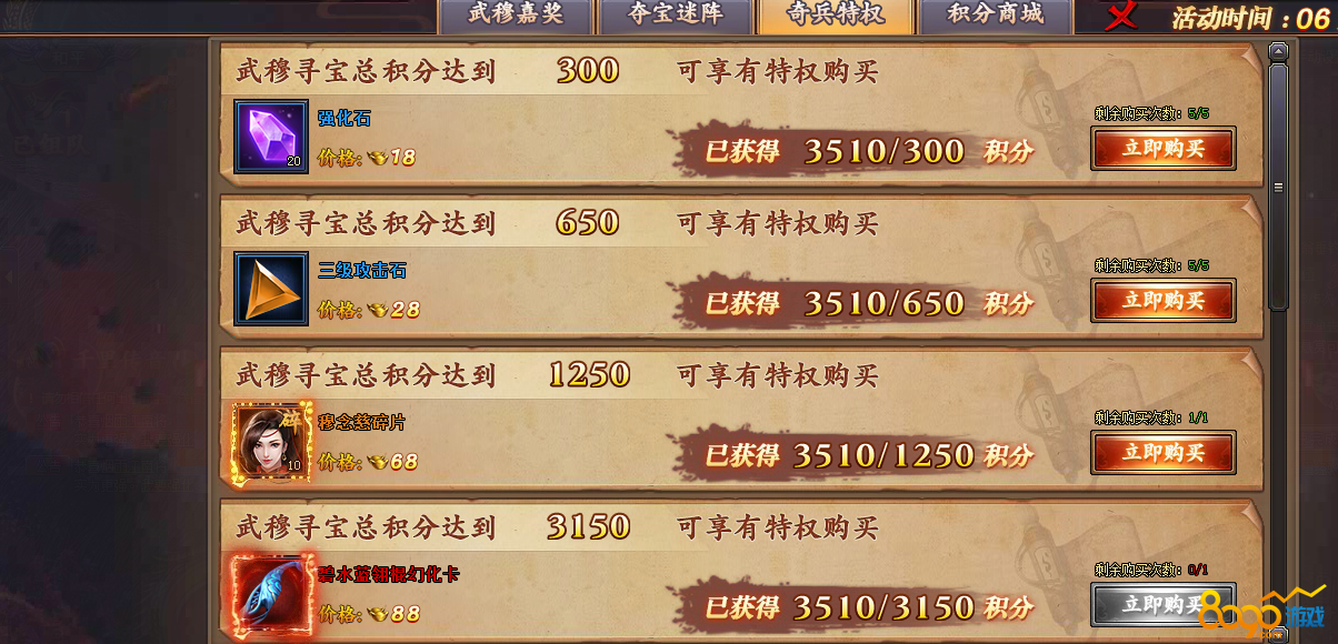 奇兵特权:在武穆寻宝可以获得积分,积分每达到一个等级就会享有特权购买机会
