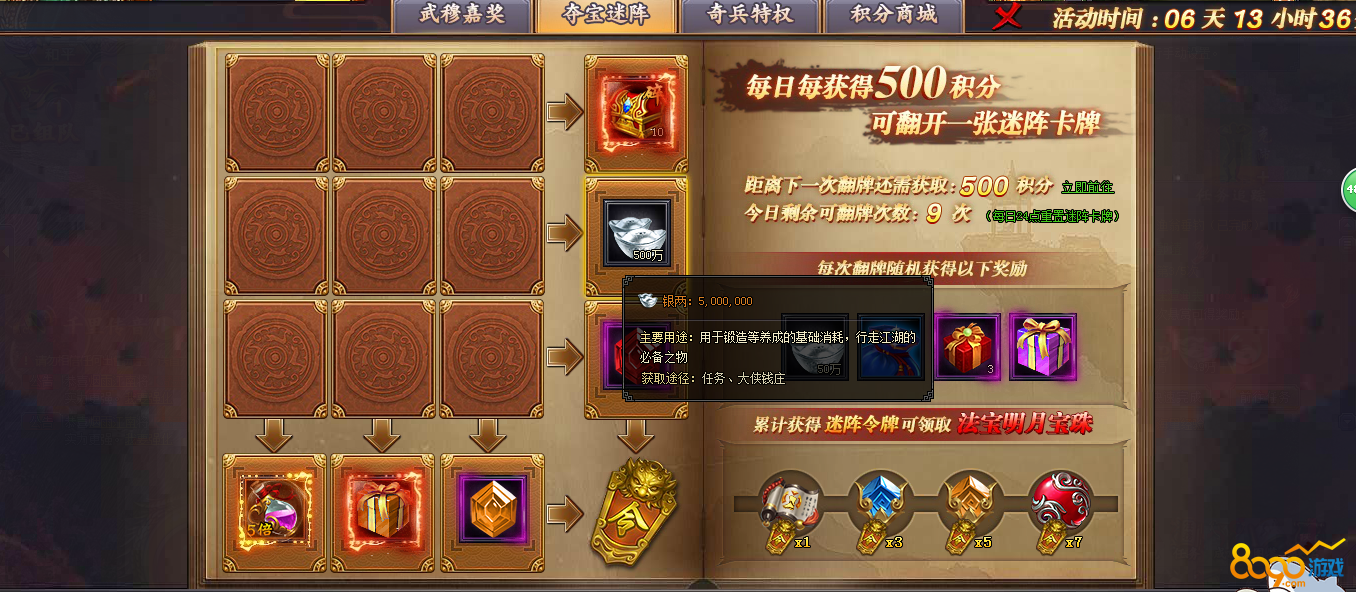 夺宝迷阵:每日每获得500积分,可翻开一张迷阵卡牌,每天可翻牌9次每次翻牌会获得4种奖励,累计获得迷阵令牌可领取法宝明月宝珠~