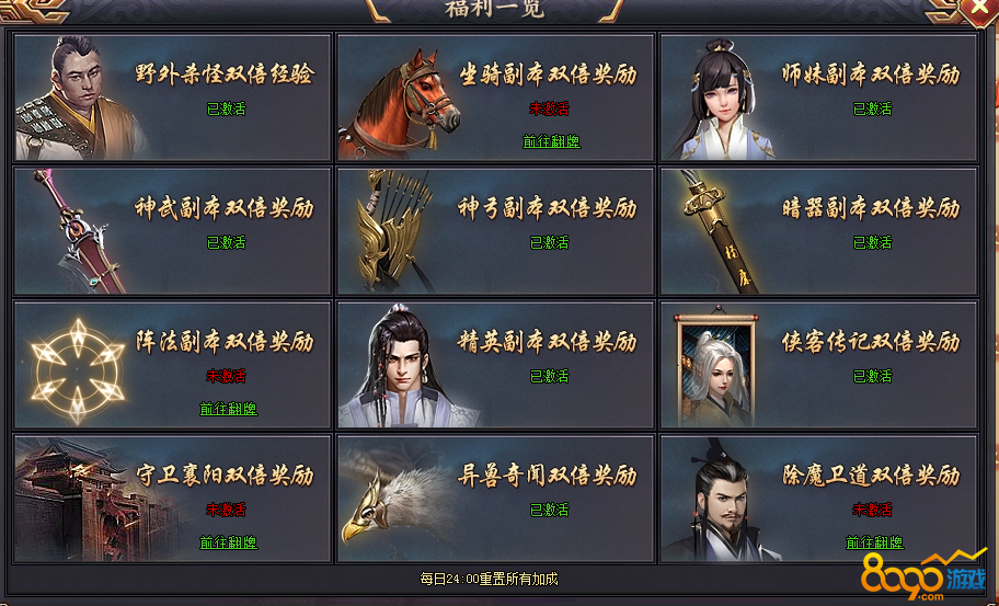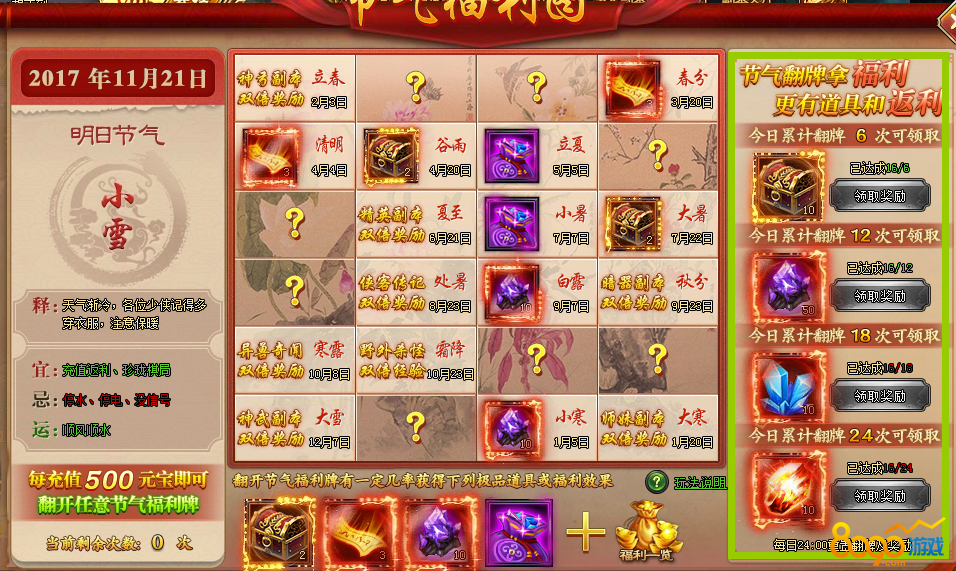 玩家每充值500元宝即可翻开任意节气福利牌。