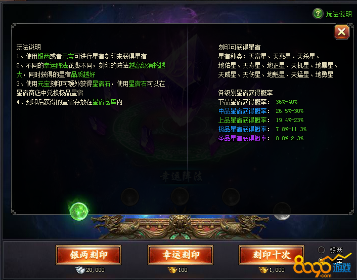 玩法说明:玩家可以用元宝和银两进行进行银两刻印,幸运刻印和刻印十次。