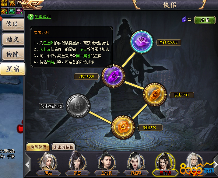 星宿说明:星宿石是镶嵌在已上阵的侠侣身上,可以提供大量属性,镶嵌在未上阵的侠侣身上不提供加成。星宿系统在侠侣里打开。