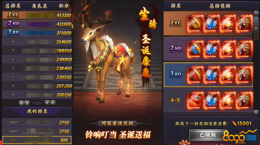 跨服总榜:总积分排名达到第1名,第2名,第3名,4-5名,6-10名,11-20名,21-40名,41-60名,61-80名,80-100名,101-200名,201-400名。401-700名,701-1000名,1000+都有不同的奖励,前60名会会的不同星级的圣诞驯鹿。