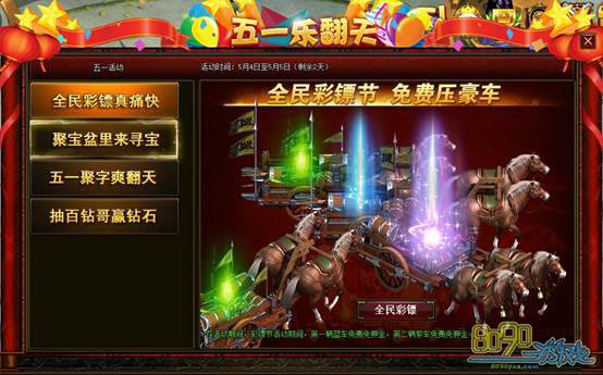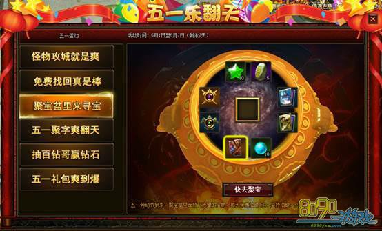 活动描述:五一活动7天时间内,每天可以从五一宝箱中抽取一个宝物,共抽取7次,坚持每天抽奖,则必中大奖:幻装神龙盘。