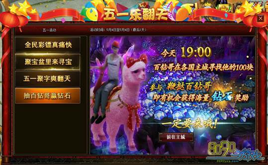 活动描述:活动期间,晚上19:00,百钻哥会出现在各国主城,参与鞭挞百钻哥即有机会获得海量钻石奖励。