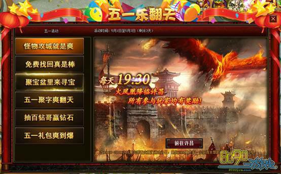 每天19:30-20:20活动内容:五一活动期间,火凤凰会带领火精攻打许昌,怪物一共有3波,每波刷新时间3分钟,一旦火凤凰被消灭则,所有参与战斗的玩家都会获得丰富奖励。