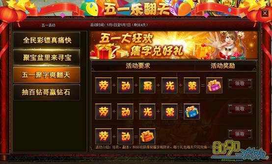 活动内容:做任务打副本击杀BOSS可以获得祝福字,集齐所需文字获得大量丰厚奖励。劳动:绿星石*2战马精魄*5铜钱2W