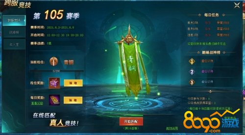 搜索"8090网页游戏"在8090上古传说游戏中,人物等级达到100级后开启跨服竞技活动,每天12:00-12:30、19:30-20:00,两个时段开启该活动,期间玩家可通过匹配来与跨服玩家进行对战。
