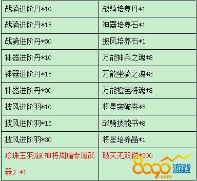 B礼包: 披风进阶丹*15 + 150W银两 + 初级战功牌*20 + 探宝符*1