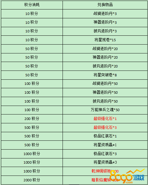 活动期间,每充值1元 即可获得1积分,获得的积分可用于换取各种极品道具,战力飞升就在今朝,机不可失,时不再来。