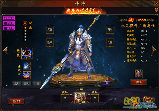 每个神将都有对应的4件装备,神将装备可以增加角色属性