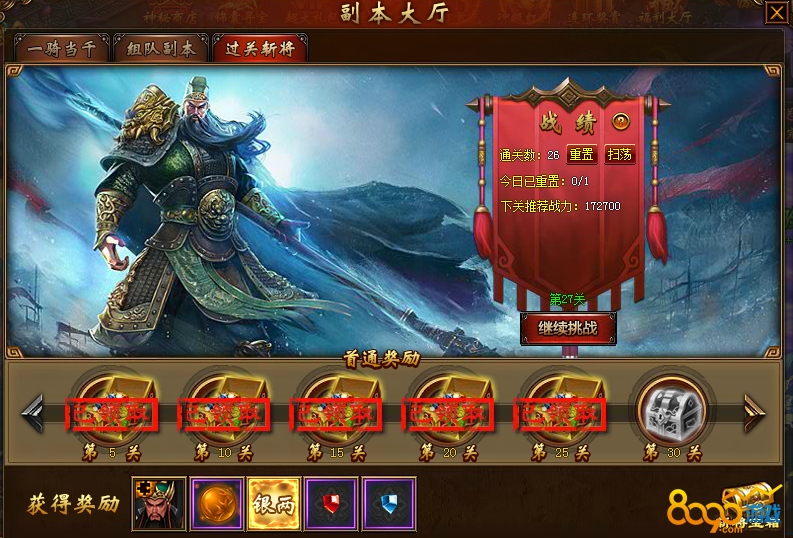 图标直接进入活动。过关斩将共有100关,每通过5关可获得通关宝箱。每个关卡的难度会随着层数的累加不断增强奖励也随之增加。每天可无限次进入副本继续挑战,并可重置一次,重置后将从第一关开始。打扫副本需要元宝,激活至尊月卡可免费扫荡,扫荡后立即完成所有已通关卡,并获得100%奖励。若扫荡时背包空间不足,所获得的奖励将存放在斩将宝箱中。