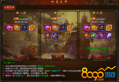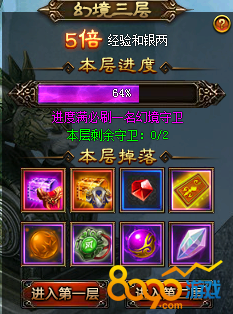 三国令水镜幻境中一共有着三层,掉宝率是野外的2倍、3倍、5倍。第一层为安全区域,禁止玩家打斗,而第二层与第三层则为PVP区域,玩家在此可以自由厮杀。玩家击杀每层小怪可增加本层进度,进度满后必定刷出一名“秘境守卫”,同时2小时也会自动刷出一名。